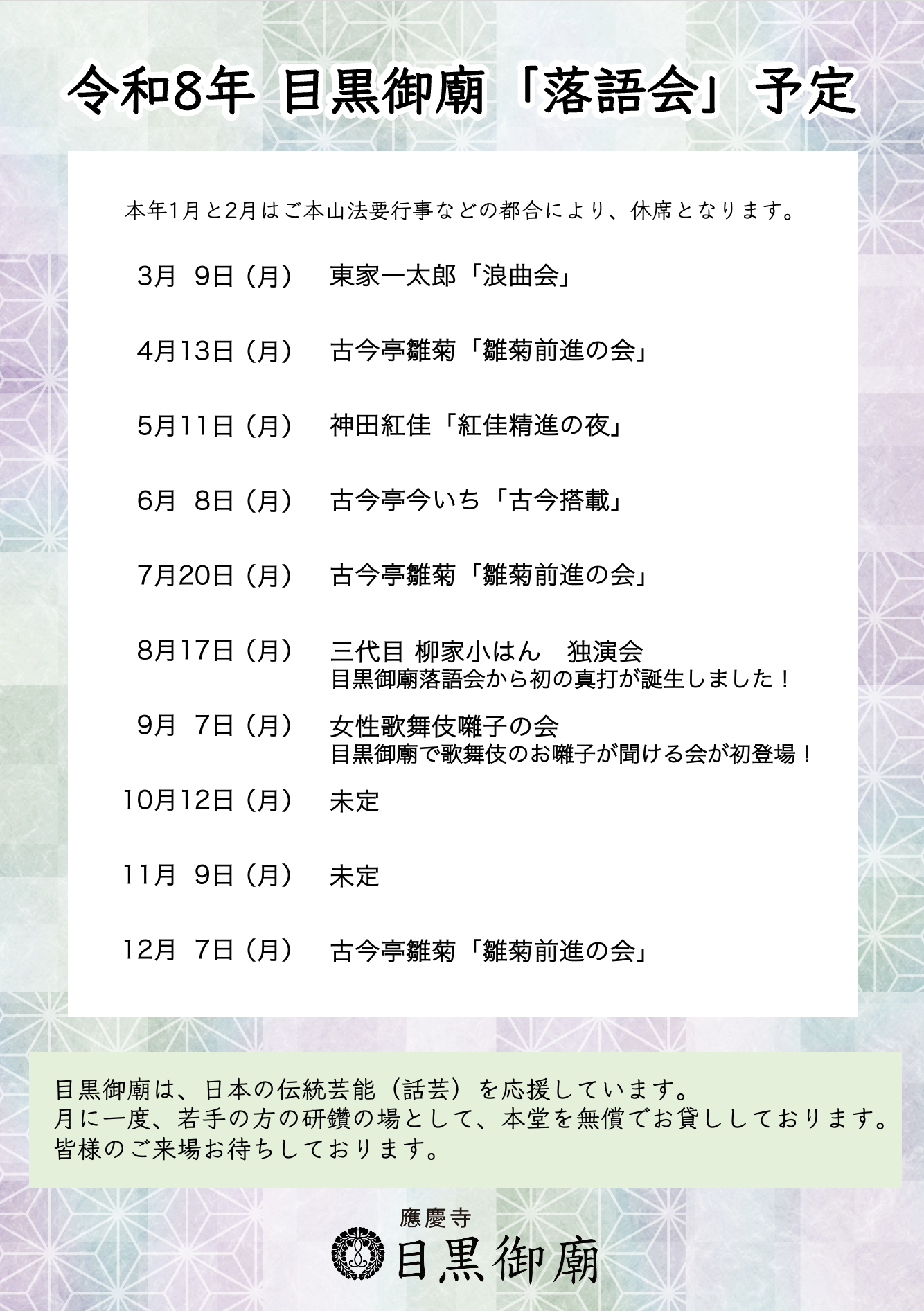 目黒御廟でも、お披露目落語会を予定しております。